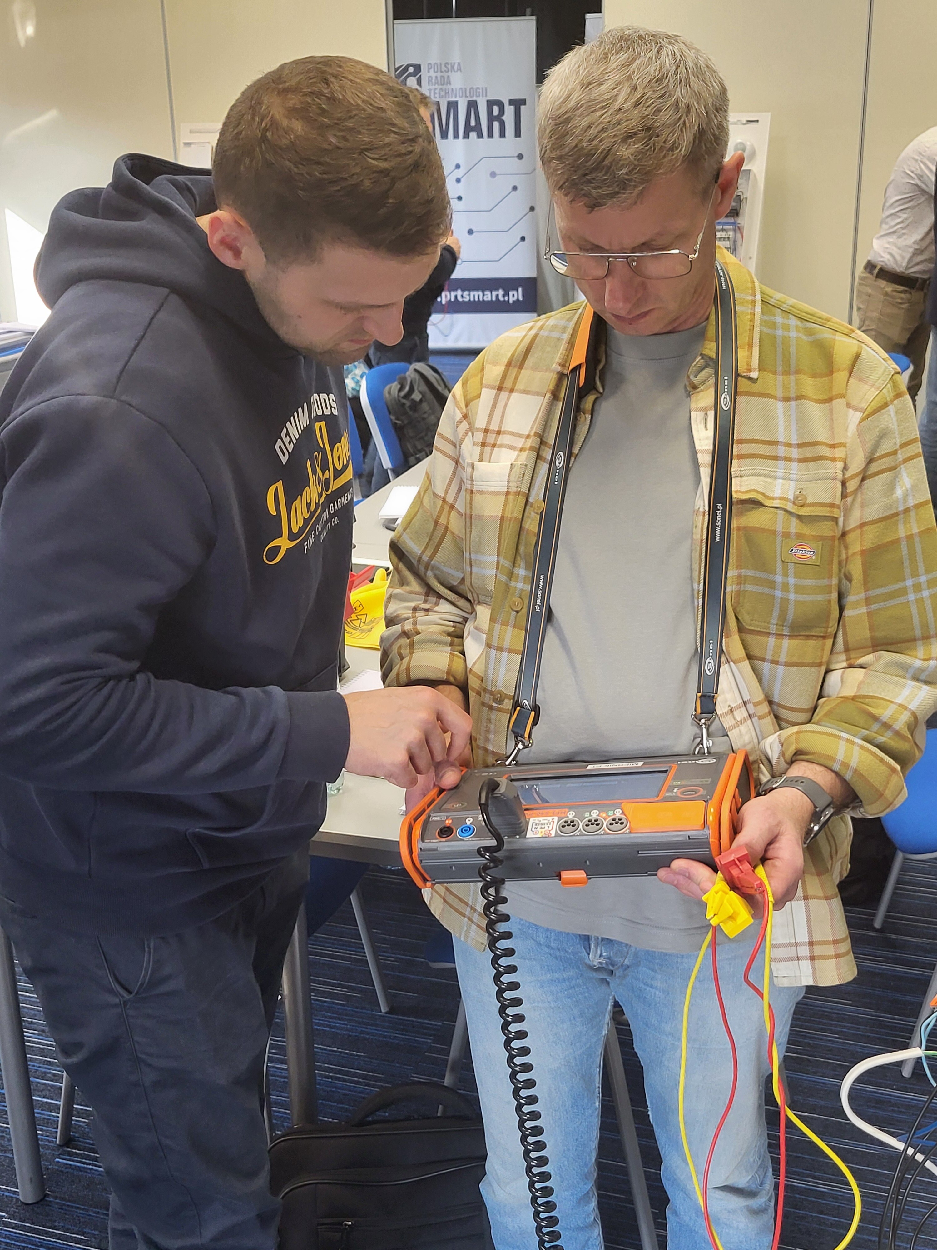 Uczestnicy pracują w zespołach dwuosobowych przy użyciu profesjonalnych mierników SONEL MPI 540 PV.